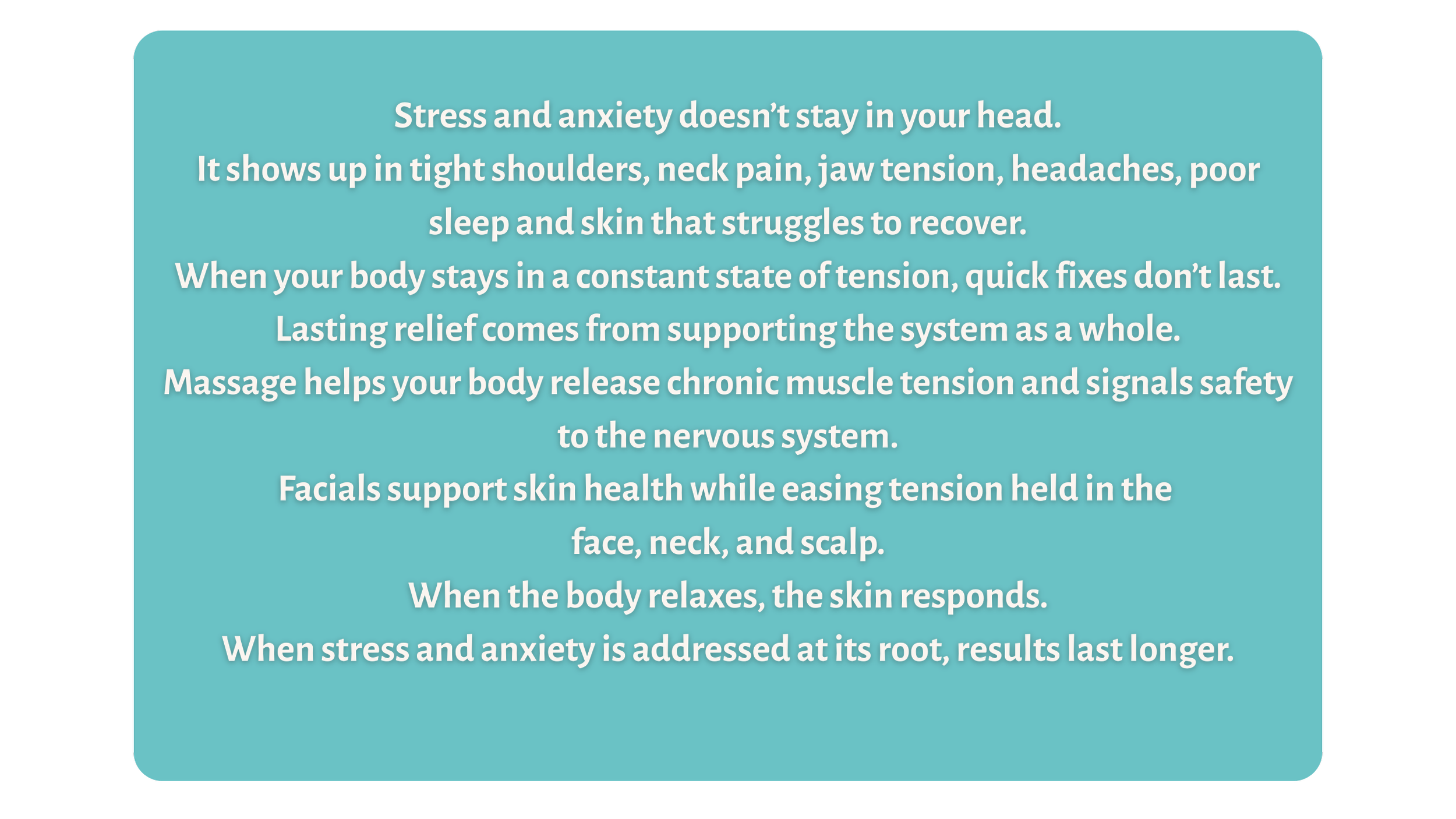 The goal is simple: Relax your body and calm your mind by listening to your concerns and working with your body to reduce pain and restore skin health.